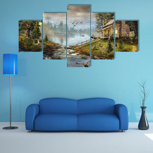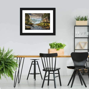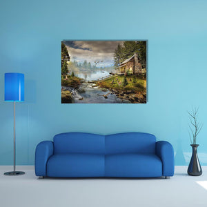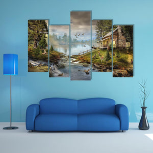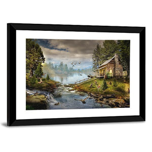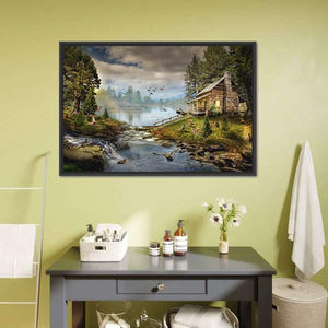 A house tucked into a green forest beside a flowing stream, captured with a realistic, rustic feel. The scene includes a waterfall, wood smoke from the chimney, birds in flight and deer grazing, using layered depth and rule-of-thirds composition to create a calm, framed view. Suited to nature-themed or rustic rooms as a peaceful focal piece.