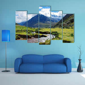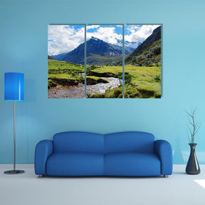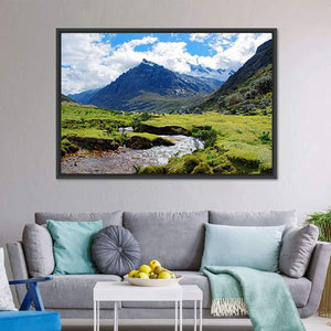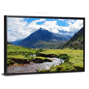 Huaraz Region in Peru shows a realistic mountain scene with snow-capped peaks, a lush green valley, a winding stream and a clear blue sky with fluffy clouds. The composition feels serene and grand, using depth and rule-of-thirds to draw the eye. It works well as room decor in modern homes, living rooms or studies where a calm, natural focal point is wanted.