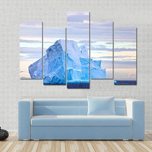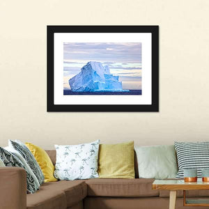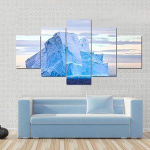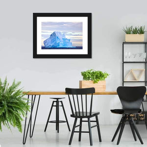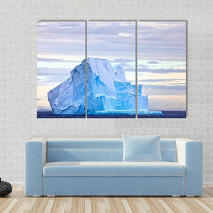 This canvas art features a striking iceberg set against a vast ocean and sky, evoking feelings of cold serenity. The realistic depiction captures the layers and sharp edges of the iceberg, complemented by a cloudy sky and dark ocean hues.