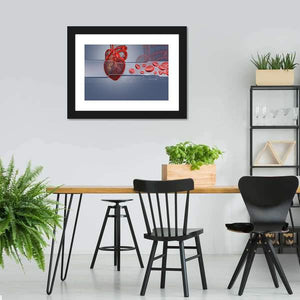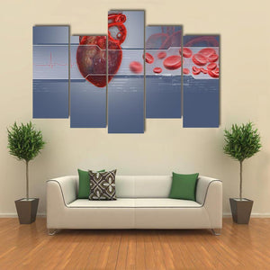 This canvas shows a realistic human heart surrounded by stylized red blood cells and a digital electrocardiogram line. The depth and rule-of-thirds composition, with a red, blue, gray, and white palette, gives it a clinical, modern scientific mood. It suits medical spaces, classrooms, or contemporary home décor.