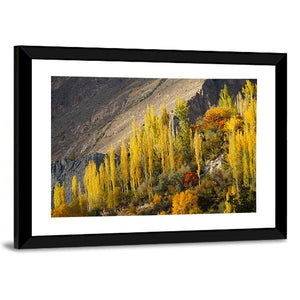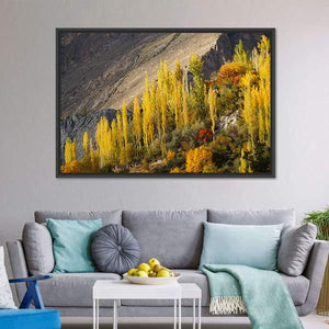This artwork features a serene view of Hunza Valley, showcasing a steep mountain slope adorned with tall yellow trees and vibrant autumn foliage. The rich palette of yellow, green, and brown creates a warm, inviting atmosphere, perfect as natural décor for any space.