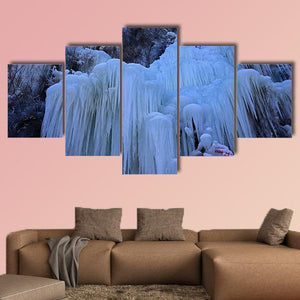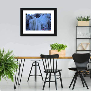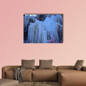 This canvas wall art captures close-up ice formations and a frozen waterfall in cool blues, white and grey, with subtle pink accents on branches. The realistic, serene, and stark composition highlights layered ice structures and brings a quiet, wintry mood that suits modern homes and room decor.