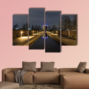 Gasometer From Olga Park Canvas Wall Art presents a symmetrical night landscape featuring a reflecting pool, a building illuminated in blue, trees, and lights lining the path. Its calm blue-and-black palette and modern, tranquil mood suit contemporary living rooms or offices.
