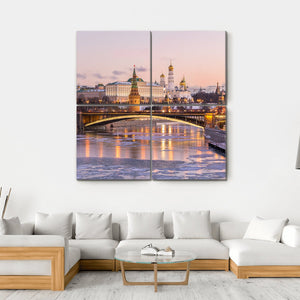 This canvas features a breathtaking view of the Moscow skyline at twilight, showcasing domed buildings and a softly glowing atmosphere. The serene palette of blue, gold, pink, and gray captures the beauty of the icy river and the surrounding architecture, making it a striking addition to any decor.