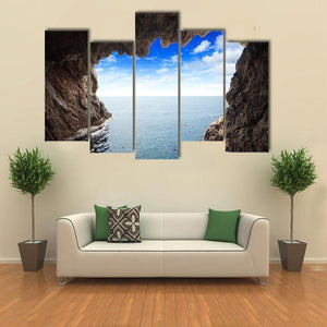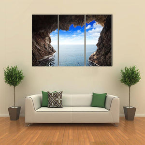 This canvas art features a serene ocean view from inside a rocky cave. The calming palette of blue, brown, and white evokes a vast, tranquil atmosphere, making it a beautiful addition to any room's decor.