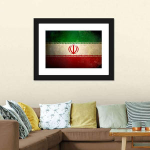 This striking canvas art features a distressed Iran flag in bold red, white, and green tones, capturing a nationalistic spirit. The textured design, including repeated Arabic script and a central emblem, adds depth and character, making it an eye-catching addition to your wall decor.