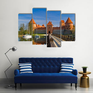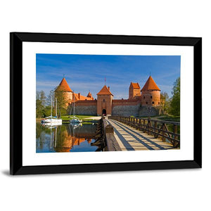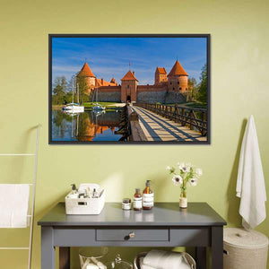 This canvas features a picturesque castle set against tranquil waters, with a charming wooden bridge, boats, and serene reflections. Its vibrant blue and orange tones create a colorful landscape that evokes a sense of history and beauty.