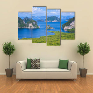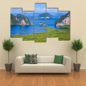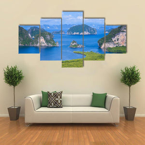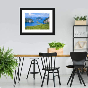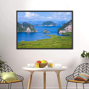 Photorealistic Samed Nang Chee Viewpoint shows limestone karst islands rising from a blue ocean, edged by mangrove forest and dense green foliage under a clear blue sky with clouds. The vibrant, serene tropical mood makes this piece a natural wall decor choice for modern living rooms, entryways, or nature-themed spaces.