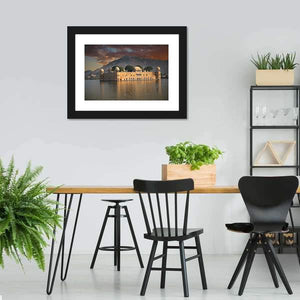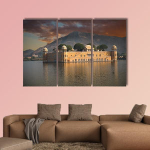 This canvas shows the Water Palace in Jaipur, its ornate domes and architecture reflected in calm lake waters under a warm sunset sky. The scene feels serene, majestic, and historical, with orange, brown and gold tones that suit modern or neutral interiors.