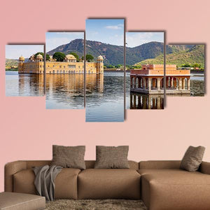 This canvas shows the Jal Mahal in Man Sagar Lake — a palace set on the water with a clear reflection and distant mountains. Rendered in blue, yellow, green, and white with a rule-of-thirds layout, it feels serene and majestic and suits modern living rooms or entryways.