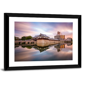 Japan At Castle Moat Canvas Wall Art presents a symmetric view of a Japanese castle beside its moat, with buildings and a long-exposure sky mirrored in the water. Soft blues, pinks and orange tones create a serene, modern mood that suits contemporary living rooms and bedrooms.