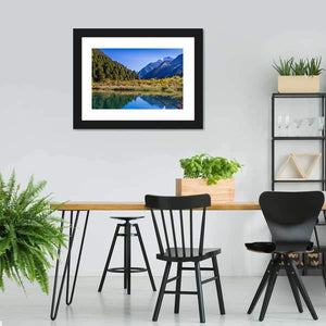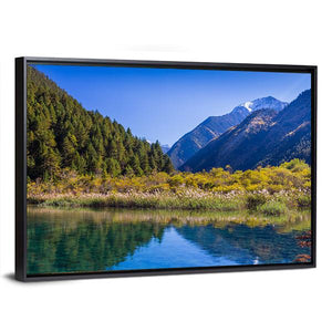 This realistic landscape of Jiuzhaigou Valley features snow-capped mountains, a reflective lake, and autumn foliage under a clear blue sky. The scene feels serene and natural, with cool blues and greens balanced by warm yellow and brown tones. It fits well as room decor in living rooms or bedrooms and complements modern home interiors.