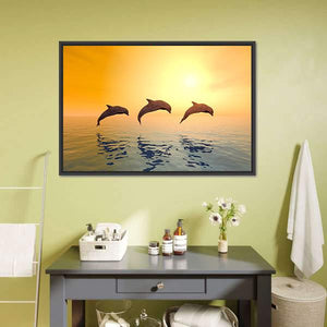 This vibrant canvas features three dolphins gracefully leaping against a serene sunset backdrop. The rich palette of orange, blue, and yellow evokes a peaceful ocean vibe, making it a lovely addition to any room decor.