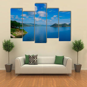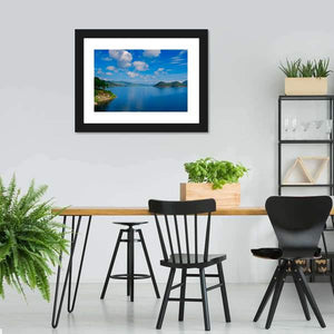 Kaeng Krachan Dam, Thailand is shown as a calm lakescape with vibrant blue water, distant mountains, fluffy white clouds, and a lush green shoreline. The scene reads as serene and peaceful, with open water occupying much of the composition. It works well in modern living rooms or other rooms that favor nature-focused wall art.