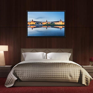 Karlsruhe Castle Reflection Canvas Wall Art shows a palace with domes mirrored in calm water at twilight, where warm lights punctuate a blue, yellow and gray palette. Rendered realistically with a symmetrical composition, the scene feels serene and elegant and suits modern interiors.