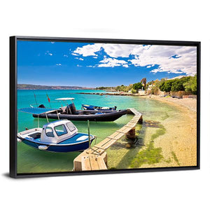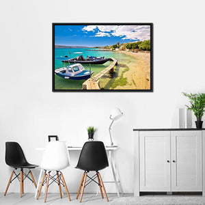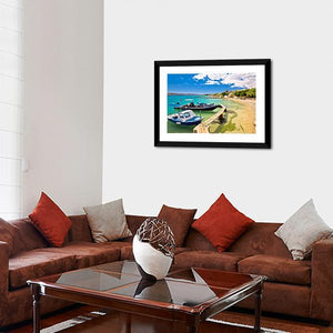 Boats On Turquoise Beach depicts boats by a wooden pier and clear turquoise water, rendered in a realistic landscape style. The scene has a calm, sunny vacation mood with a sense of depth from its rule-of-thirds composition. It suits modern or coastal living spaces and room decor that lean toward nature-inspired art.