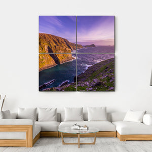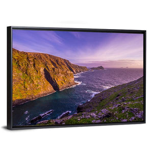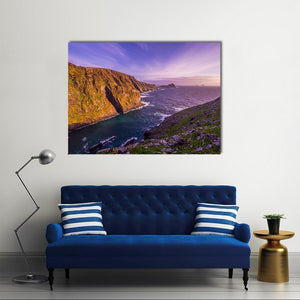 This canvas wall art captures the breathtaking beauty of Ireland's coastal cliffs, showcasing rugged rock formations beneath a dramatic sunset sky. The serene palette of purple, orange, and blue enhances the awe-inspiring view of foamy waves and streaky clouds, perfect for bringing a touch of nature indoors.