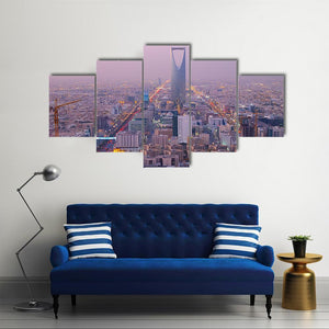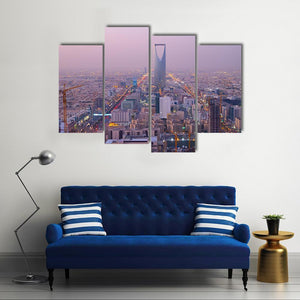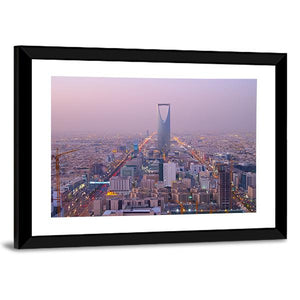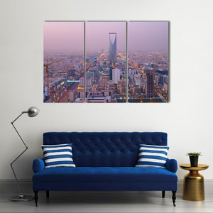 This canvas art features the Riyadh skyline with the iconic Kingdom Centre tower as a focal point. The urban scene, captured in an aerial view, showcases vibrant city lights against a rich palette of purple, blue, gold, white, and black.