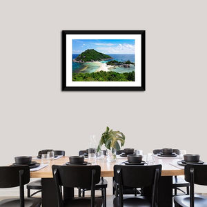 This vibrant canvas artwork captures the serene beauty of Koh Nang Yuan Island, showcasing clear turquoise waters, lush green foliage, and white sandy beaches. Its photorealistic style invites a sense of peaceful vacation ambiance, perfect for enhancing your wall decor.