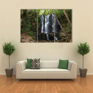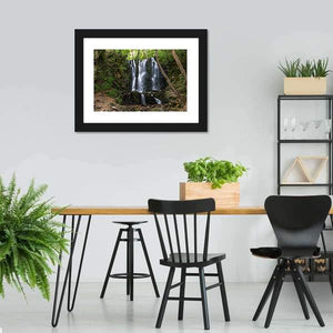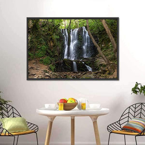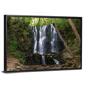 Koleshino Waterfalls Canvas shows a forest waterfall surrounded by rocks, trees and lush green foliage, with wooden stairs beside the cascade. The realistic nature photograph uses depth and a rule-of-thirds composition to create a serene, natural, refreshing mood. Suited to modern living rooms, bedrooms, and nature-inspired room decor.
