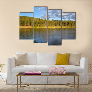 This realistic landscape shows a river winding through a dense evergreen forest under puffy clouds, with sunlight reflecting on the water. The scene has a peaceful, natural mood and reads like a calm summertime day. It fits well in modern homes and nature-themed rooms looking for serene wall art.