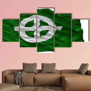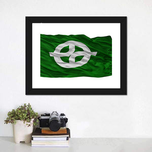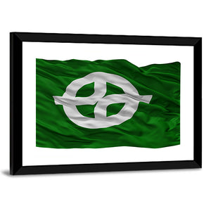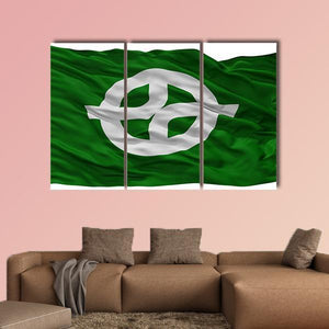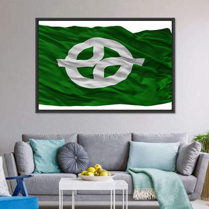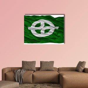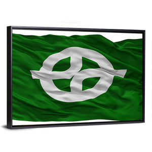 Kyotanabe City Flag canvas art presents a centered, symmetrical geometric symbol in green and white that names Kyotanabe, Japan. The modern, abstract print feels simple, clean, and bold with a subtle waving flag texture that adds gentle movement—suitable for modern home decor.