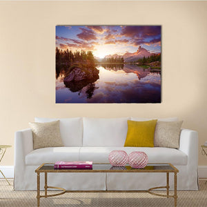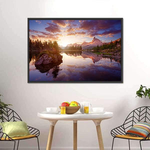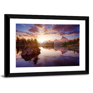 This captivating canvas art features serene views of Lago Di Federa, showcasing a tranquil lake surrounded by majestic mountains and lush trees. The reflective calm waters capture a dramatic sunset, blending colorful hues of purple, orange, and pink, making it a perfect addition to your nature-inspired decor.