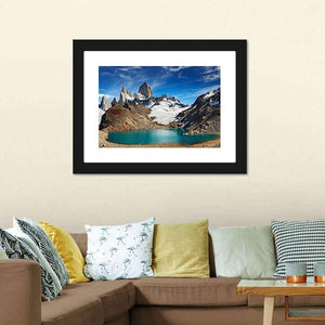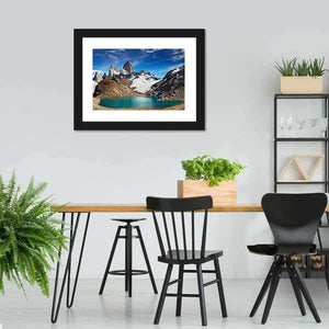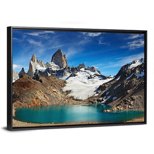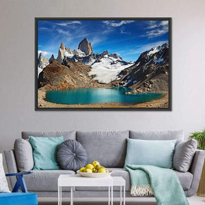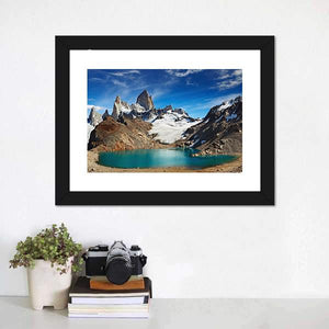 This canvas art captures the serene beauty of Laguna De Los Tres in Argentina, featuring majestic mountains and a stunning turquoise lake. The composition highlights jagged peaks against a backdrop of wispy clouds, creating a tranquil atmosphere perfect for nature lovers.