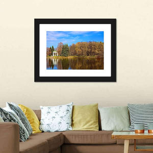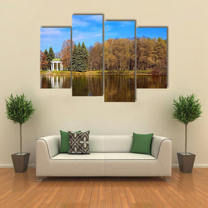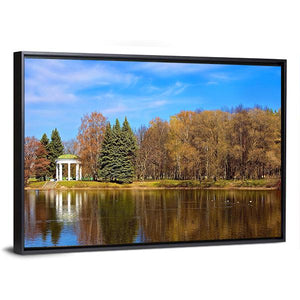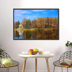 Lake Gazebo In Autumn Canvas presents a peaceful, realistic landscape: a white gazebo with columns by a calm lake, autumnal trees and sky, and clear reflections on the water. The blue, green, brown and white palette creates a serene, autumnal feel that fits modern living rooms or other nature-focused rooms.