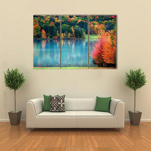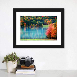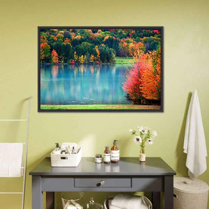 A lake scene framed by autumn trees and forest, with rich blues and warm fall tones and mirrored reflections on the water. Rendered in a realistic nature-photography style, it feels vibrant, peaceful, and serene — a calm focal point for modern or nature-themed rooms and wall decor.