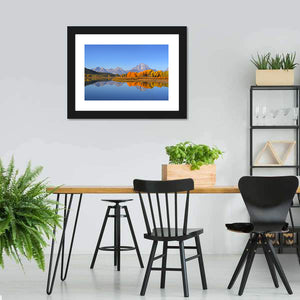 A photorealistic view of Grand Tetons National Park in autumn, with snow-capped mountains reflected in a calm lake and vibrant orange and green foliage. The serene, colorful scene fits well in modern living rooms, bedrooms, or offices where a restful landscape brings quiet energy.