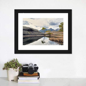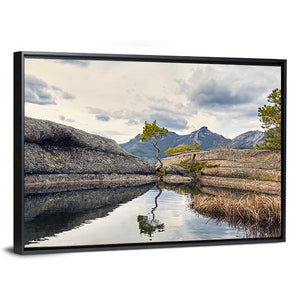 This landscape shows a bonsai-like pine curving over a calm lake, with mountains and rocky shorelines mirrored in the water. The rule-of-thirds composition and a soft green-blue-gray palette create a serene, natural atmosphere that suits rustic or modern nature-focused rooms.