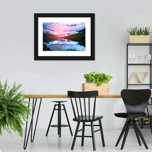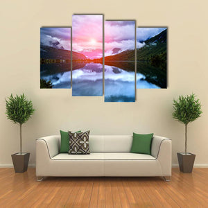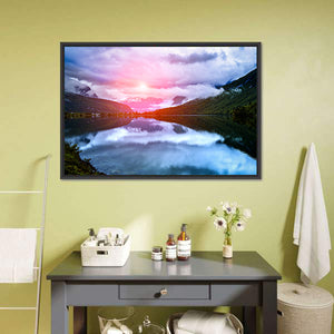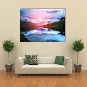 This canvas shows a lake in Norway beneath mountains and a cloud-filled sunset, with the sun peeking through clouds and the scene reflected on calm water. The modern composition uses rule-of-thirds and mirror symmetry to create a serene yet dramatic atmosphere that works well in modern living rooms or bedrooms.