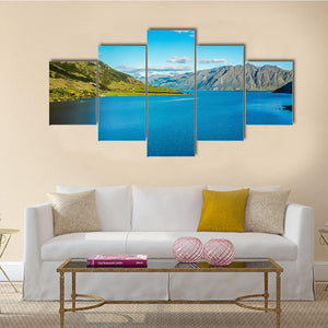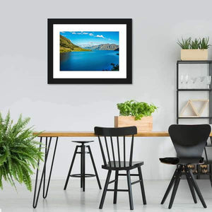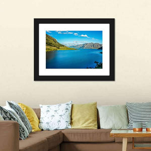 A photorealistic landscape of a New Zealand lake, with vibrant blue water, grassy foothills and rugged mountains beneath puffy white clouds. The image uses rule-of-thirds and layered depth to create a peaceful, serene, and majestic atmosphere. Works well with modern room decor and calm living spaces like a living room or bedroom.
