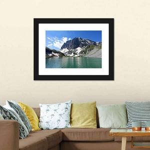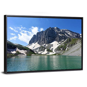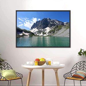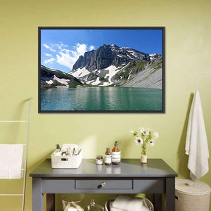 Lake Kseroloutsa Canvas Wall Art presents a wide, realistic view of a mountain lake with snow-capped peaks, rocky terrain and clouds in the sky. The blue, green, white and grey palette creates a serene, majestic mood that brings calm to a room. It works well with modern room decor and other nature-focused wall art.