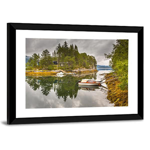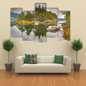 Lake On An Island Canvas Wall Art shows a small, tree-covered island with two boats docked beside it and a cloudy sky mirrored in calm water. The realistic landscape uses green, blue, brown, gray and white tones to create a serene, peaceful mood. It suits modern, nature-inspired rooms as a quiet wall accent.