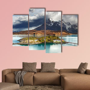 Lake Pehoe Canvas Wall Art shows an island with small buildings beside a blue-green lake and snow-capped mountains, rendered in a realistic landscape with an overcast daytime sky. Its serene yet dramatic mood fits modern living rooms or offices that favor natural, muted colors.