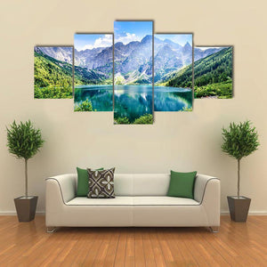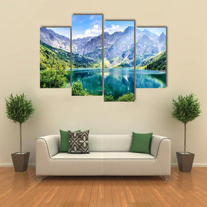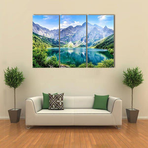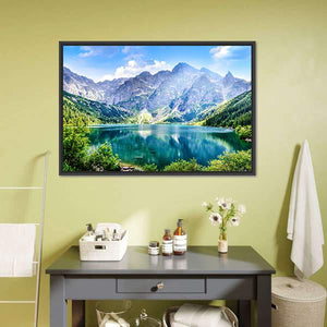 This canvas depicts mountains, a lake, trees and sky with sunlight on the peaks and clear reflections in the water. The scene feels serene and majestic, with soft blues and greens that suit modern home décor and room decor such as a living room or bedroom.
