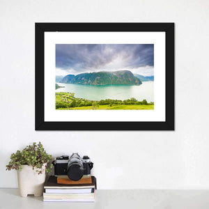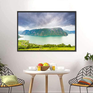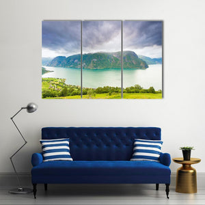 A realistic, wide-angle view of a Norway fjord with snow-capped mountains, cliffs, a village by the water, and lakes. The green, blue, grey and white palette and stormy clouds create a serene yet dramatic atmosphere that suits modern rooms or nature-focused decor.