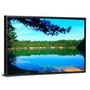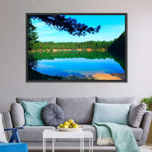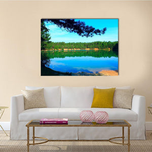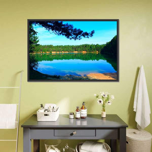Emerald Water Lake In Forest shows a realistic lakeside scene with a calm lake reflecting the forest and sky and pine needles in the foreground. The blue, green, brown, and white palette gives a serene, peaceful mood that suits modern or nature-inspired rooms.