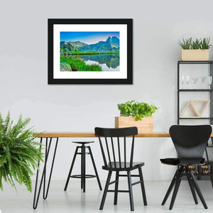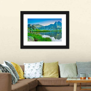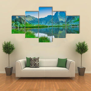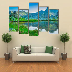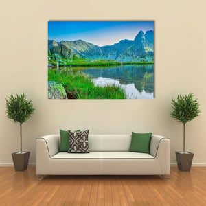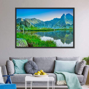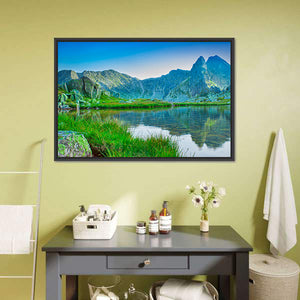 Lake With Retezat Mountain Canvas depicts a mountain lake framed by rocky peaks and green grass, with a clear blue sky and a crisp reflection in the water. The rule-of-thirds composition and a blue-green-gray-brown palette give the scene a serene, natural, and majestic mood. Suited to modern or nature-inspired rooms like living rooms and bedrooms.