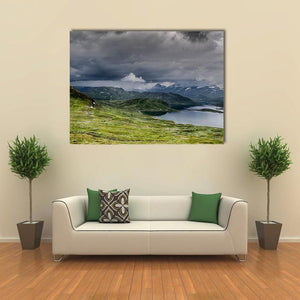 This captivating canvas features a serene lake surrounded by rolling green hills and majestic mountains. The dramatic stormy sky adds a moody ambiance, making it a striking addition to your home décor.