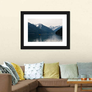 This serene landscape features majestic snow-capped mountains reflecting over a tranquil lake, complemented by a charming yellow boat. The calming palette of blue, green, and gray brings nature's beauty indoors.
