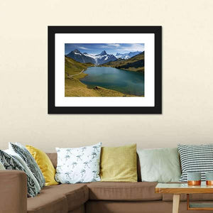 This canvas shows a mountain lake with snow‑capped peaks, grassy hills and a winding path. A clear blue sky, a glacier-tipped summit and the mountains’ reflection in the water contribute to a serene, majestic mood. Works well in modern or nature-inspired rooms as a calm focal piece.