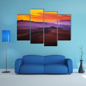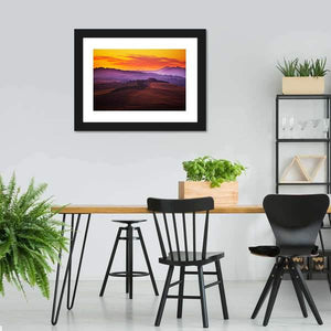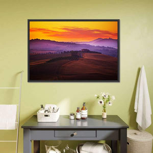 Tuscany At Sunset captures rolling hills, a farmhouse and rows of cypress trees bathed in warm orange and purple sunset light. The scene feels serene and peaceful, with lightly textured hills and distant mountains that add depth; it suits rustic or vintage interiors as calm room decor.