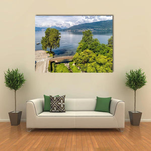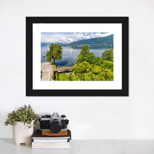 Lake Maggiore In Summer Canvas Wall Art shows a photorealistic view of Lake Maggiore with a small boat on the water, a stone bridge, and a paved road bordered by lush green trees. The layered, aerial perspective and blue‑green, gray, and white palette create a serene, peaceful mood that suits modern, nature-inspired interiors.