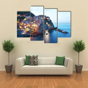 This canvas captures the coastal village of Manarola, Italy in a wide, realistic view, showing cliffside houses above the ocean at dusk. Warm lights reflected on calm water and a blue‑orange palette create a serene, picturesque mood that works well in coastal or modern room decor.