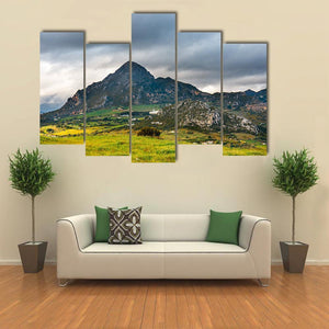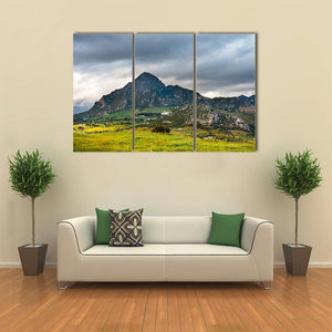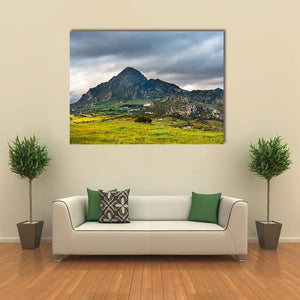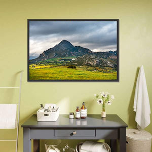 Sierra Crestellina Andalusia Canvas Art shows a mountain landscape with green fields, clouds, and a white building on the mountainside, with a cluster of trees in the foreground. The rule-of-thirds composition and a palette of green, gray, brown, white and touches of yellow give the scene a dramatic, serene, and expansive mood. Suited to modern room decor and nature-focused interiors.