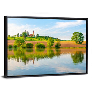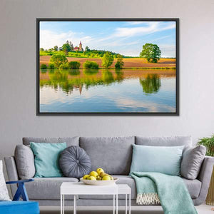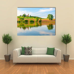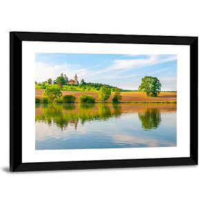 A realistic landscape of a small church beside a lake, with rolling hills, trees and fields and a clear reflection in the water. Soft blues and greens with touches of brown, white and red create a peaceful, scenic, tranquil mood. Suits modern room decor and nature-inspired interiors.