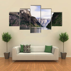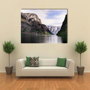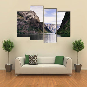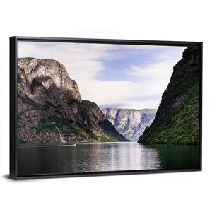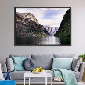 This Norwegian fjord canvas shows a calm fjord framed by steep mountains, with a small white boat on the water and a distant waterfall. The realistic nature-photography style and cool blue-green-gray palette create a serene, majestic mood. It works well as nature-focused wall decor for a living room or entryway.